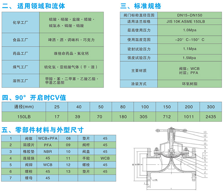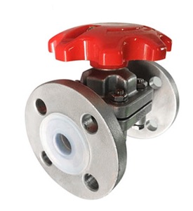 襯氟隔膜閥是一種特殊形式的具有截斷功能的閥門。襯氟隔膜閥與其它閥門大的區別在于:采用無填料函的構造;襯氟隔膜閥隔膜可使流道內的腐蝕性介質與所有驅動部件處於完全隔離的狀態,從而杜絕了通常閥門的“跑、冒、滴、 孺”等弊端。在化工、制酸、制堿、冶煉、稀土、農藥等行業生產系統中應用較為廣泛。