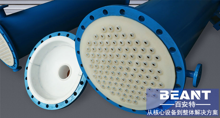 氟塑料列管式換熱器又稱管殼式換熱器。是以封閉在殼體中管束的壁面作為傳熱面的間壁式換熱器。這種換熱器結構較簡單,操作可靠,可用各種結構材料制造,能在高溫、高壓下使用,是目前應用廣泛的類型。 百安特可根據不同的介質及工況條件選用合適的襯里材料及工藝,為客戶提供全面的解決方案。