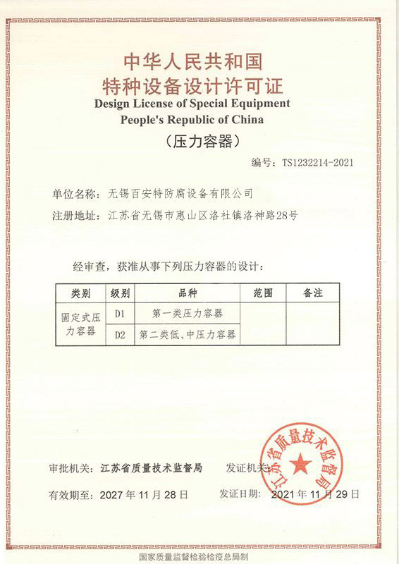 百安特石化裝備(江蘇)有限公司 坐落在美麗的湖濱城市無(wú)錫,百安特自成立起一直專(zhuān)注于從事化工防腐蝕設(shè)備的研發(fā)設(shè)計(jì)與生產(chǎn)制造,針對(duì)客戶(hù)的生產(chǎn)工藝提供最優(yōu)的防腐蝕解決方案及產(chǎn)品選型。公司總?cè)藬?shù)約86人,擁有D1、D2類(lèi)壓力容器生產(chǎn)資質(zhì),其中設(shè)計(jì)研發(fā)人員12人以上,資深防腐工程師5人以上。